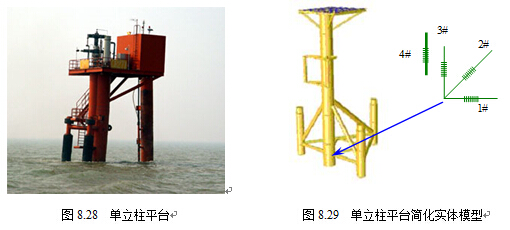 CB271單井平臺由單立柱導(dǎo)管架、水下樁、上部平臺組成。單立柱導(dǎo)管架采用單立柱和三腿水下導(dǎo)管架形式。導(dǎo)管架的三個面均為直立,水下導(dǎo)管架水平面為等邊三角形,三個腿位于三角形的頂點,單立柱位于三角形底邊的中點。單立柱平臺與簡化實體模型分別如 REF _Ref175388756 \h \* MERGEFORMAT 圖8.28和 REF _Ref175388765 \h \* MERGEFORMAT 圖8.29所示。