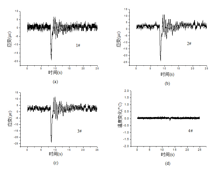 圖8. SEQ 圖8. \* ARABIC 31 埋入式FBG傳感器測得的在船撞擊下的應(yīng)變變化過程