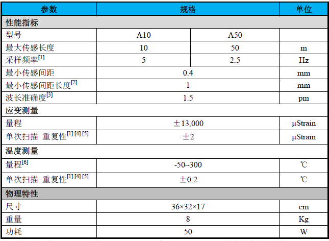 2.最小傳感間距長度通過使用最大測量范圍實現(xiàn),但是單次掃描的重復(fù)性會不同,應(yīng)變重 復(fù)性為±17.0μStrain,溫度重復(fù)性±2.0℃。