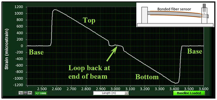 上圖是利用 ODiSI A 進行分布式應(yīng)變測試演示試驗,光纖粘貼在鋁合金懸臂梁的上表面和下 表面,在本試驗中,傳感測試點保持 5mm 間隔,傳感間距長度為 1cm。