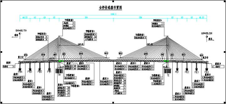 健康監(jiān)測與安全預(yù)警系統(tǒng)施工圖設(shè)計(jì)內(nèi)容包括鋼箱拱、承臺(tái)、橋面、吊桿、系桿等結(jié)構(gòu)健康監(jiān)測系統(tǒng)的設(shè)計(jì)。其中,鋼箱拱健康監(jiān)測內(nèi)容設(shè)計(jì)包括鋼箱拱拱內(nèi)的應(yīng)變、溫度、濕度監(jiān)測, 三角剛構(gòu)的應(yīng)變、溫度監(jiān)測以及混凝土拱座的裂縫與溫度監(jiān)測;承臺(tái)監(jiān)測包括裂縫、溫度監(jiān)測;橋面監(jiān)測包括振動(dòng)、環(huán)境狀況監(jiān)測;吊桿監(jiān)測內(nèi)容即為索力監(jiān)測;系桿監(jiān)測內(nèi)容包括應(yīng)變、應(yīng)力監(jiān)測。